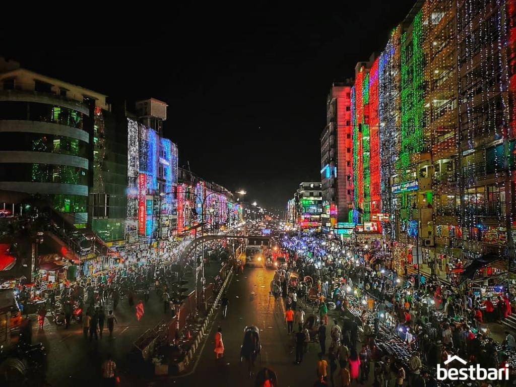 The busy streets of Mirpur light up at night presents a lively and energetic atmosphere.